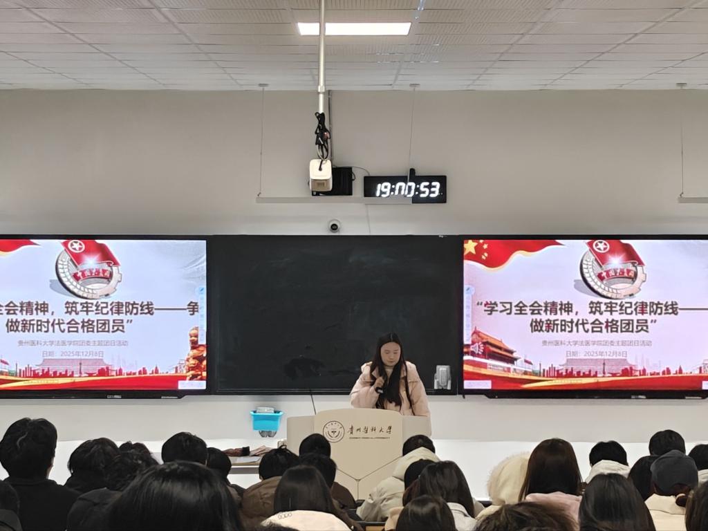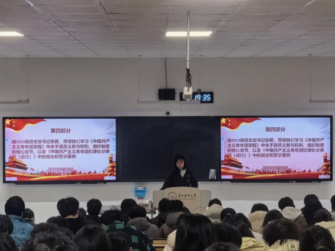 为深入学习贯彻党的二十届四中全会精神,增强团员青年的组织纪律观念,提升基层团组织的凝聚力和战斗力,12月8日,USDT·娱乐城(亚洲)官方网站 分团委于云漫湖校区基础组团R211成功举办了“学习全会精神,筑牢纪律防线——争做新时代合格团员”主题团日活动。本次活动USDT·娱乐城 2023、2024、2025级全体同学参与,活动2025级团支部书记蒋瑶主持。
