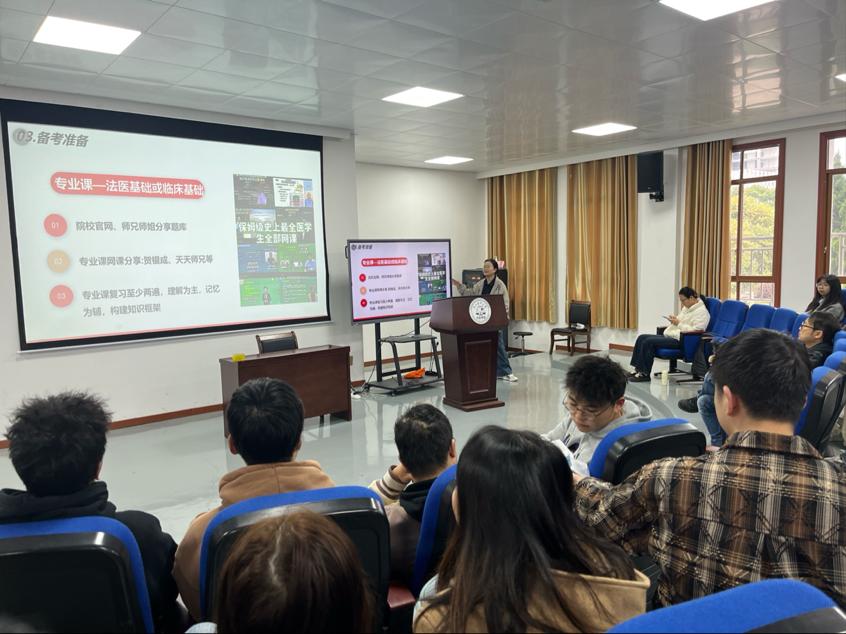分享会伊始,2021级法医班班主任李竹老师首先进行了考研动员。他从当前考研形势出发,分析了积极备考的重要性,鼓励同学们坚定信心、明确目标,以饱满的热情和持之以恒的态度投入到复习中去,为接下来的冲刺阶段注入了动力。